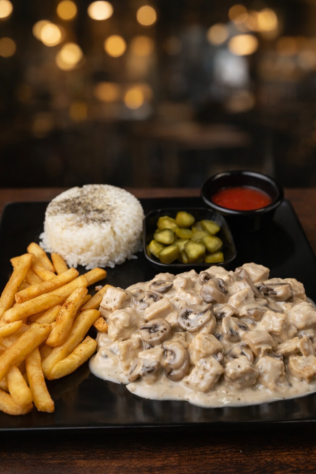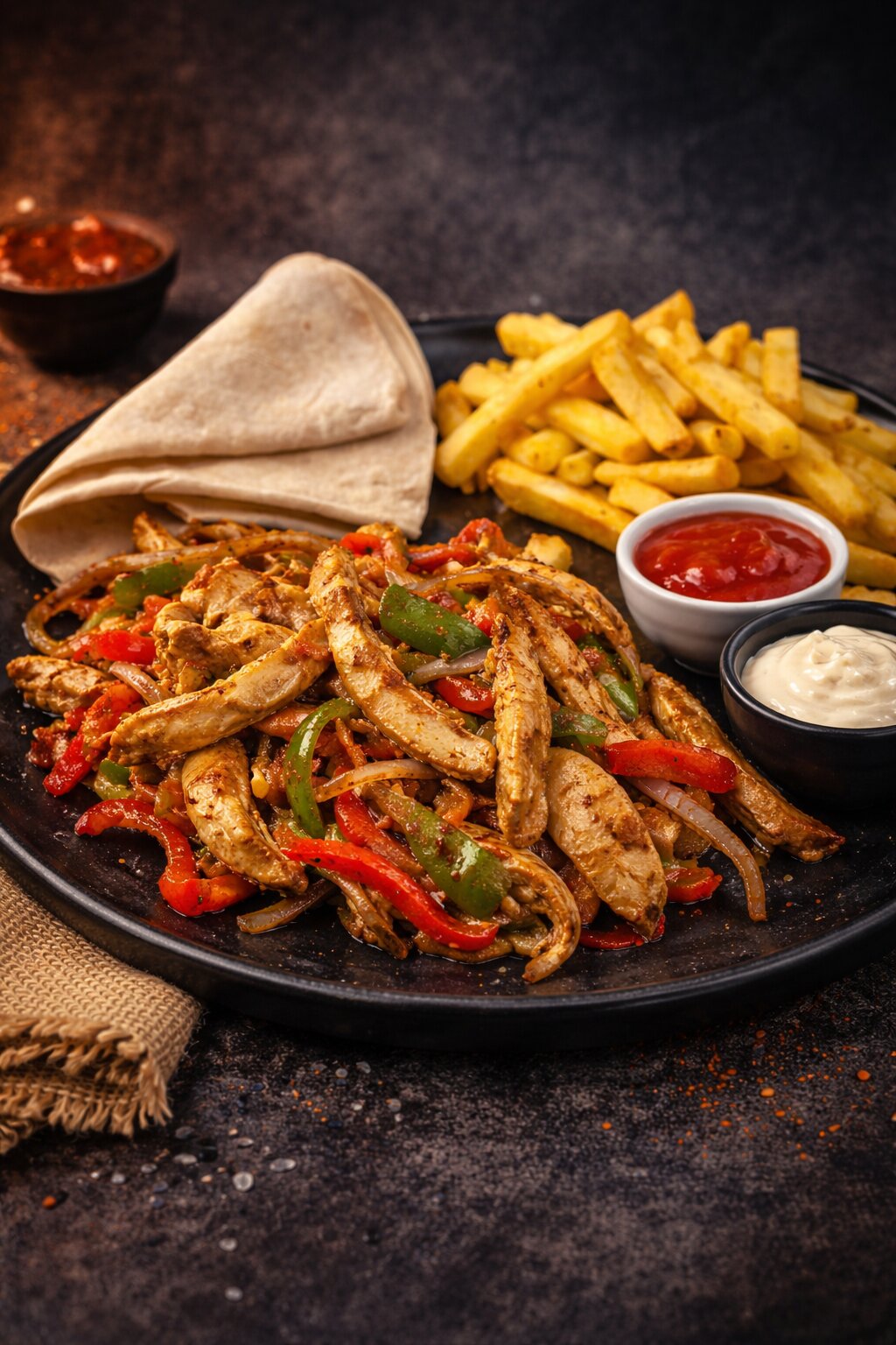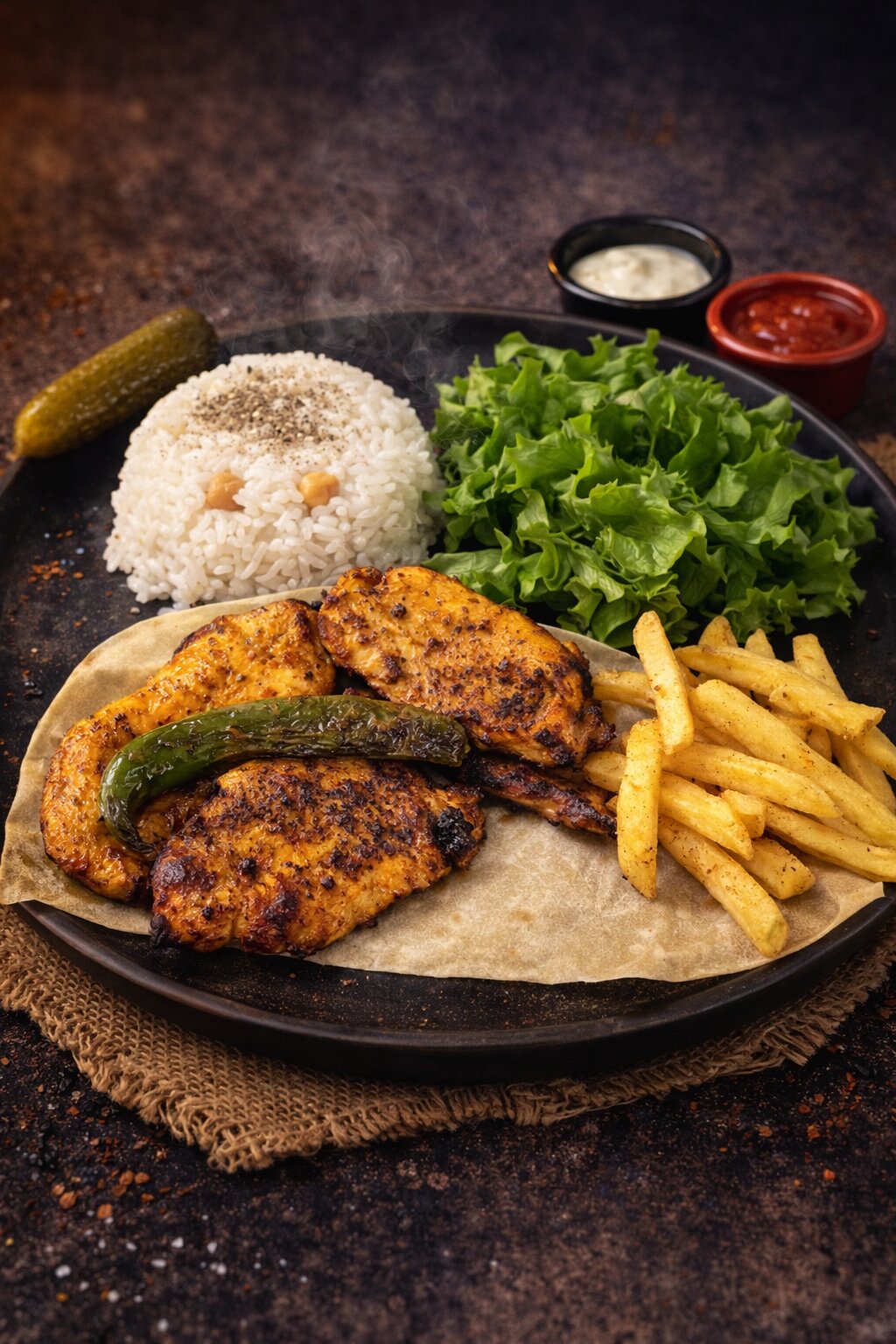 Pilav, salata, patates cips, lavaş ve seçeceğiniz 1 adet sos ile servis edilmektedir.