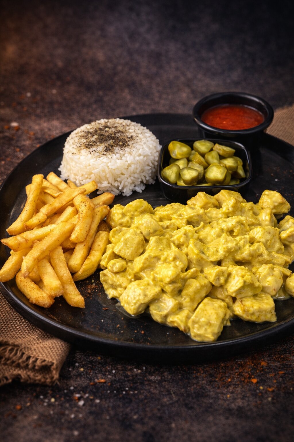 Pilav, turşu, ekmek, patates cips ve seçeceğiniz 1 adet sos ile servis edilmektedir.