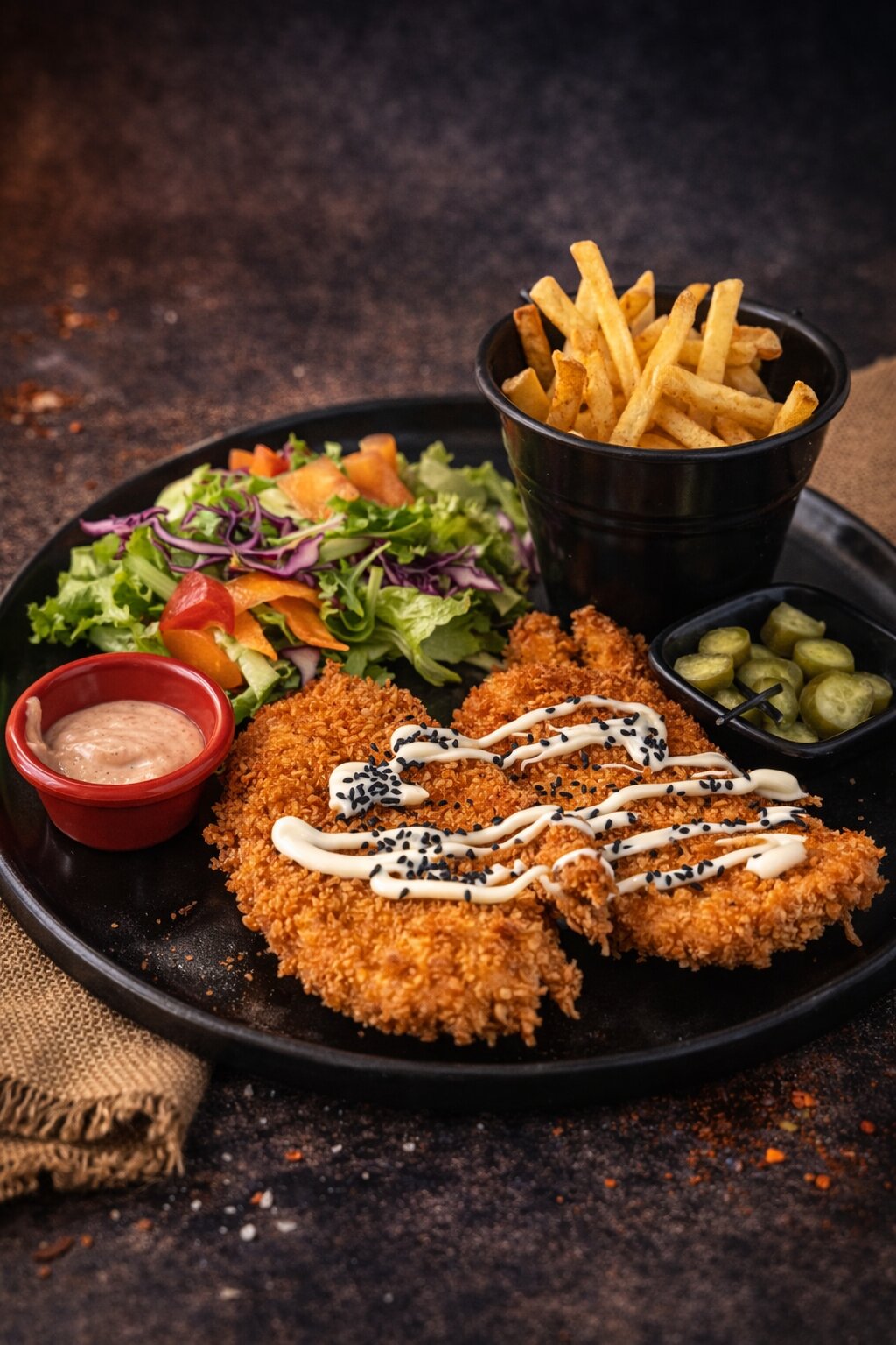 Mevsim salata, patates cips, lavaş ve seçeceğiniz 1 adet sos ile servis edilmektedir.